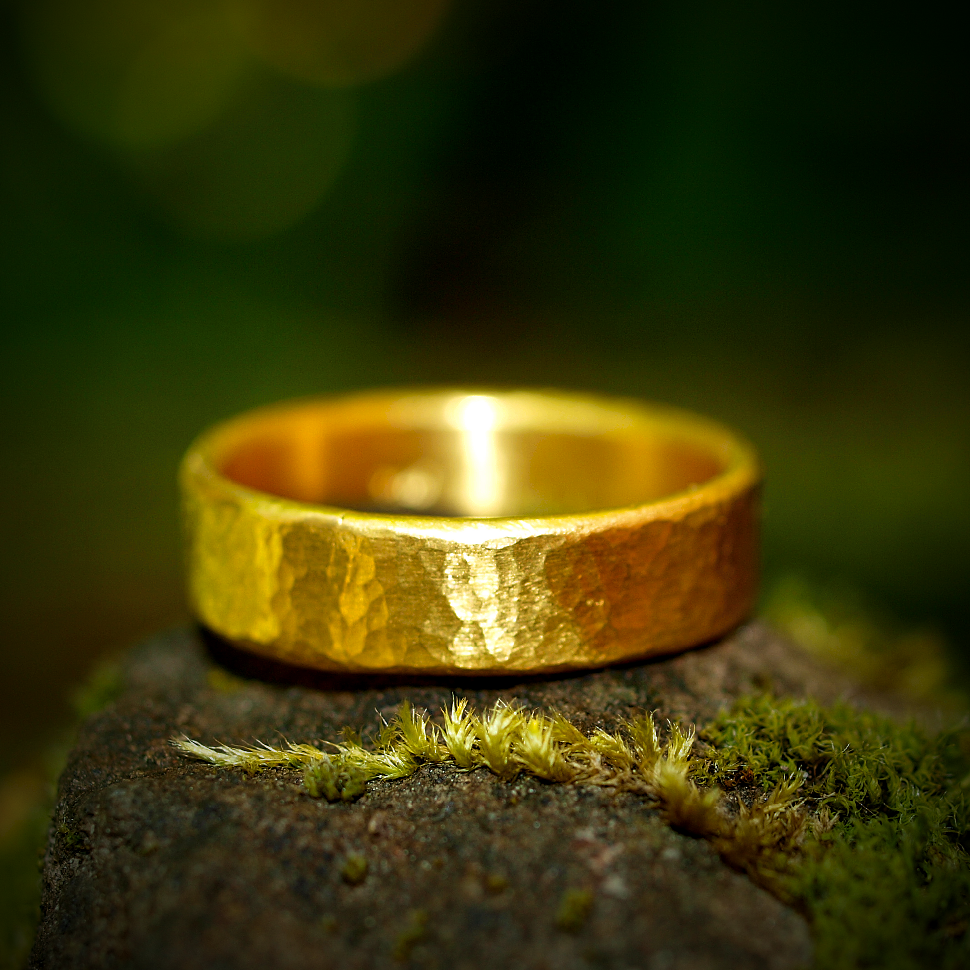 24k Classic Flat Band - Hammered Texture - Genuine Pure Gold
