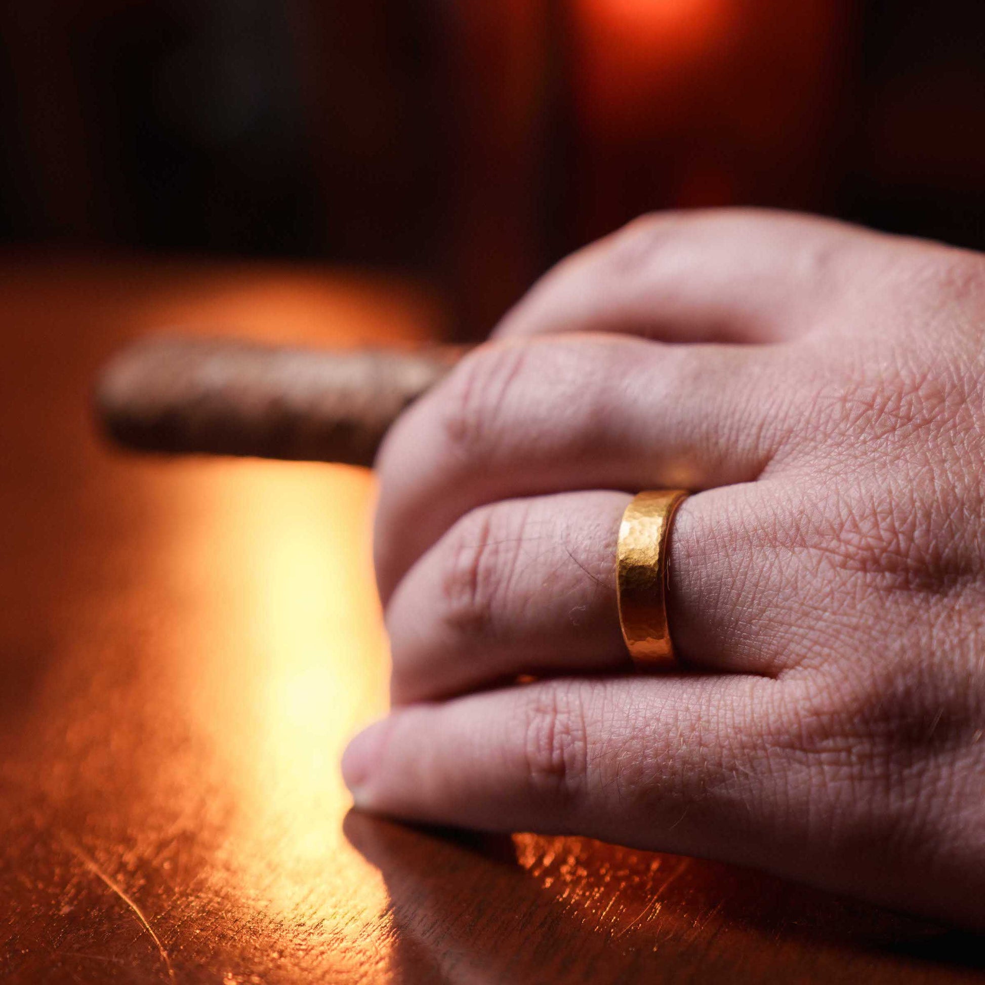 Crafted from solid 24k pure gold, this classic flat band features a balanced, comfortable fit. The lightly hammered texture adds subtle visual interest while maintaining a timeless design. Its thickness and durable construction ensures lasting wear, making it an elegant choice for everyday sophistication.
