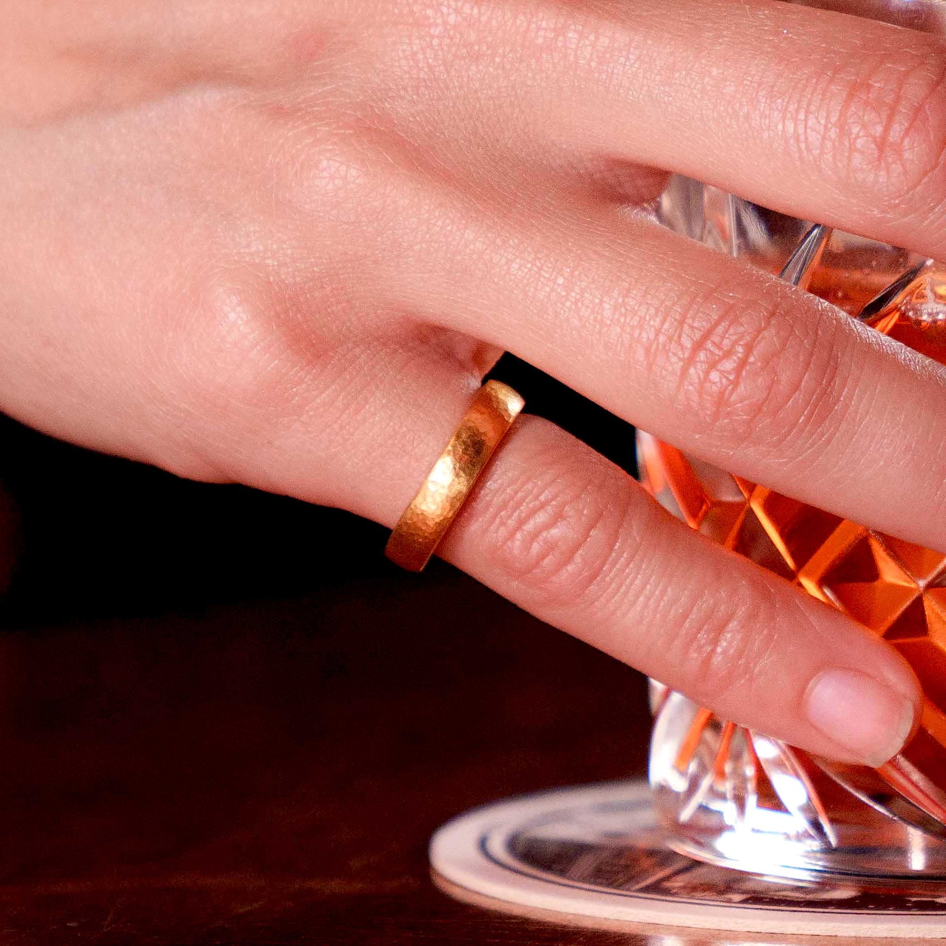This 24k solid gold band features a dense, slightly rounded design with a generous thickness and a 4mm width. Crafted for a comfort fit, it easily slips on and off while maintaining a secure feel. The pure gold offers a brilliant, warm glow, making this ring a durable and elegant choice for those valuing both substance and refined craftsmanship.